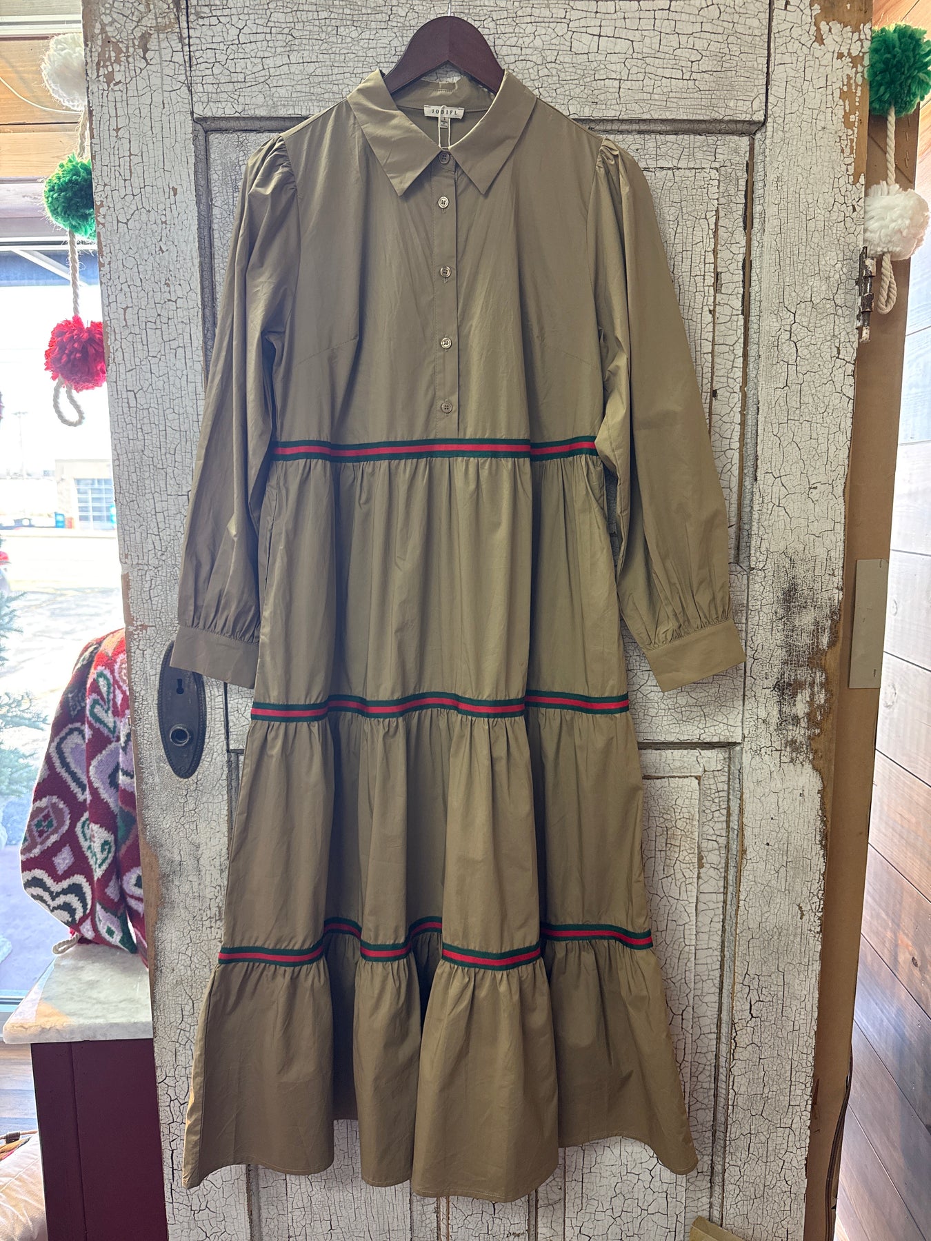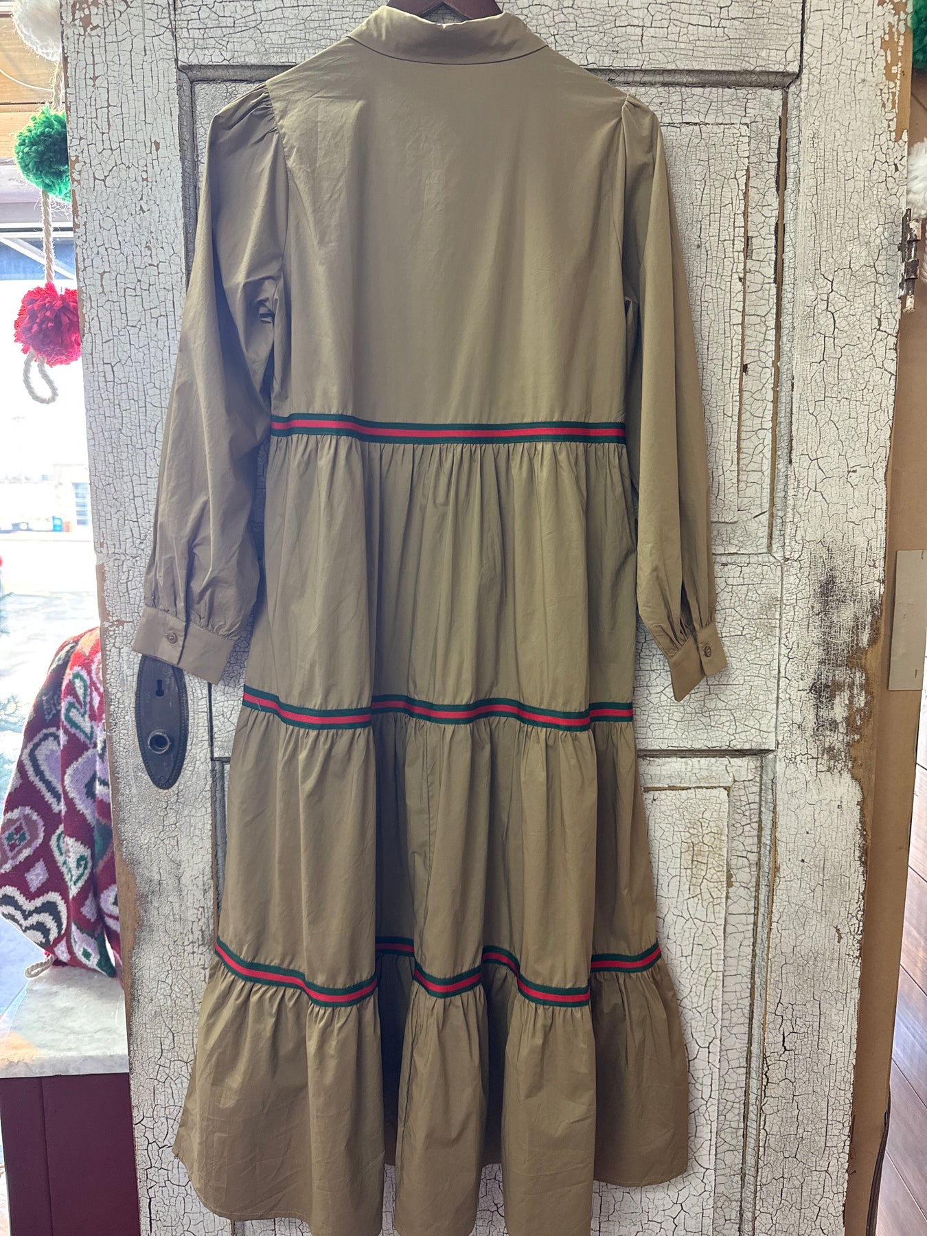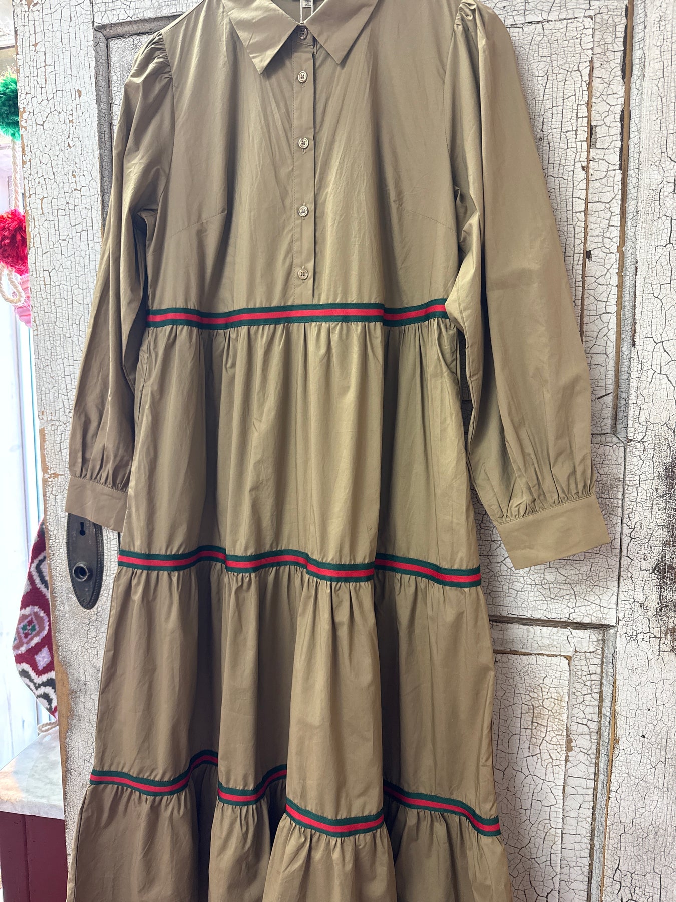 Long sleeves tiered solid midi dress with stripe tape trim accent, front button up, collared neckline, side pockets