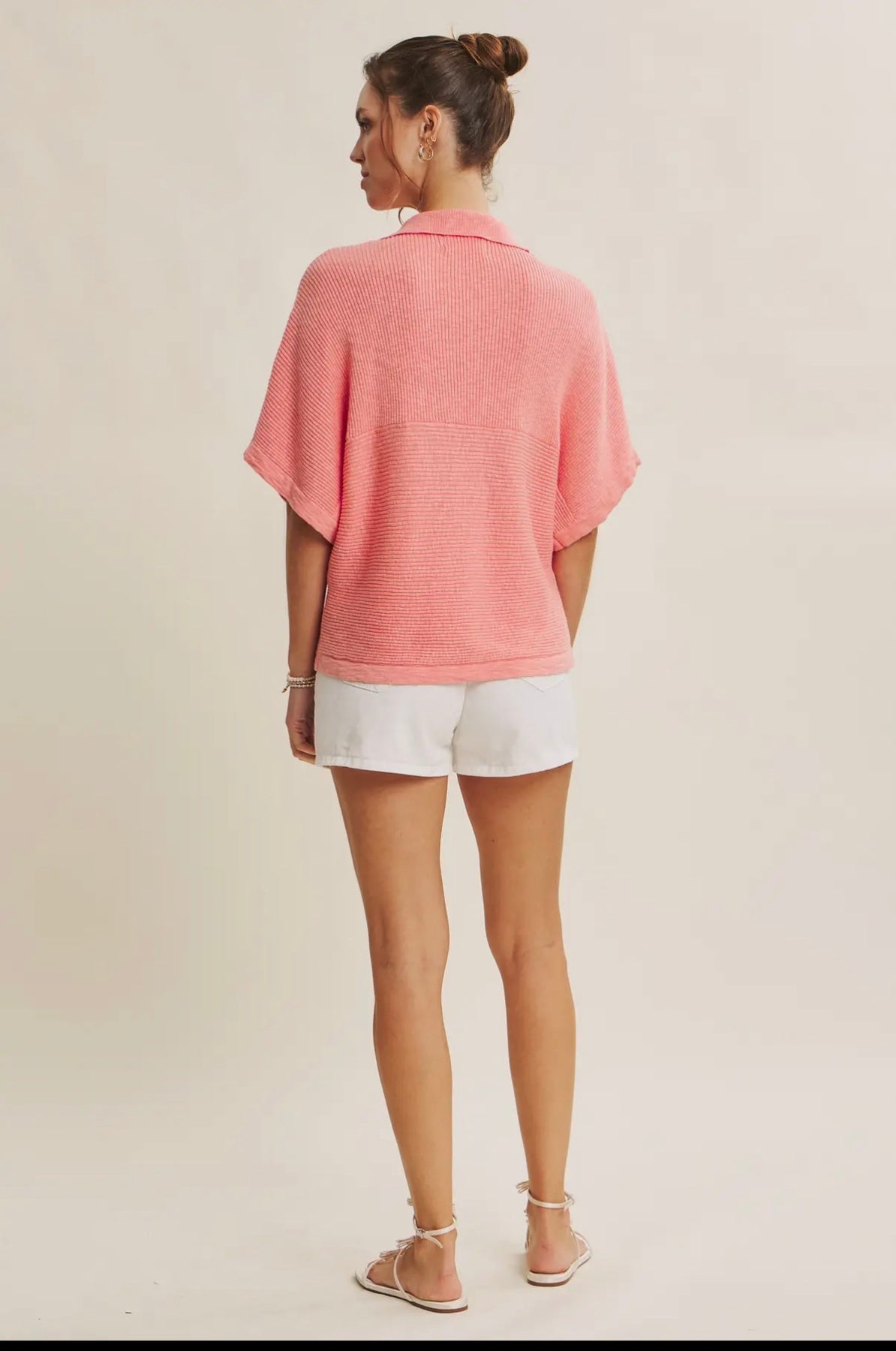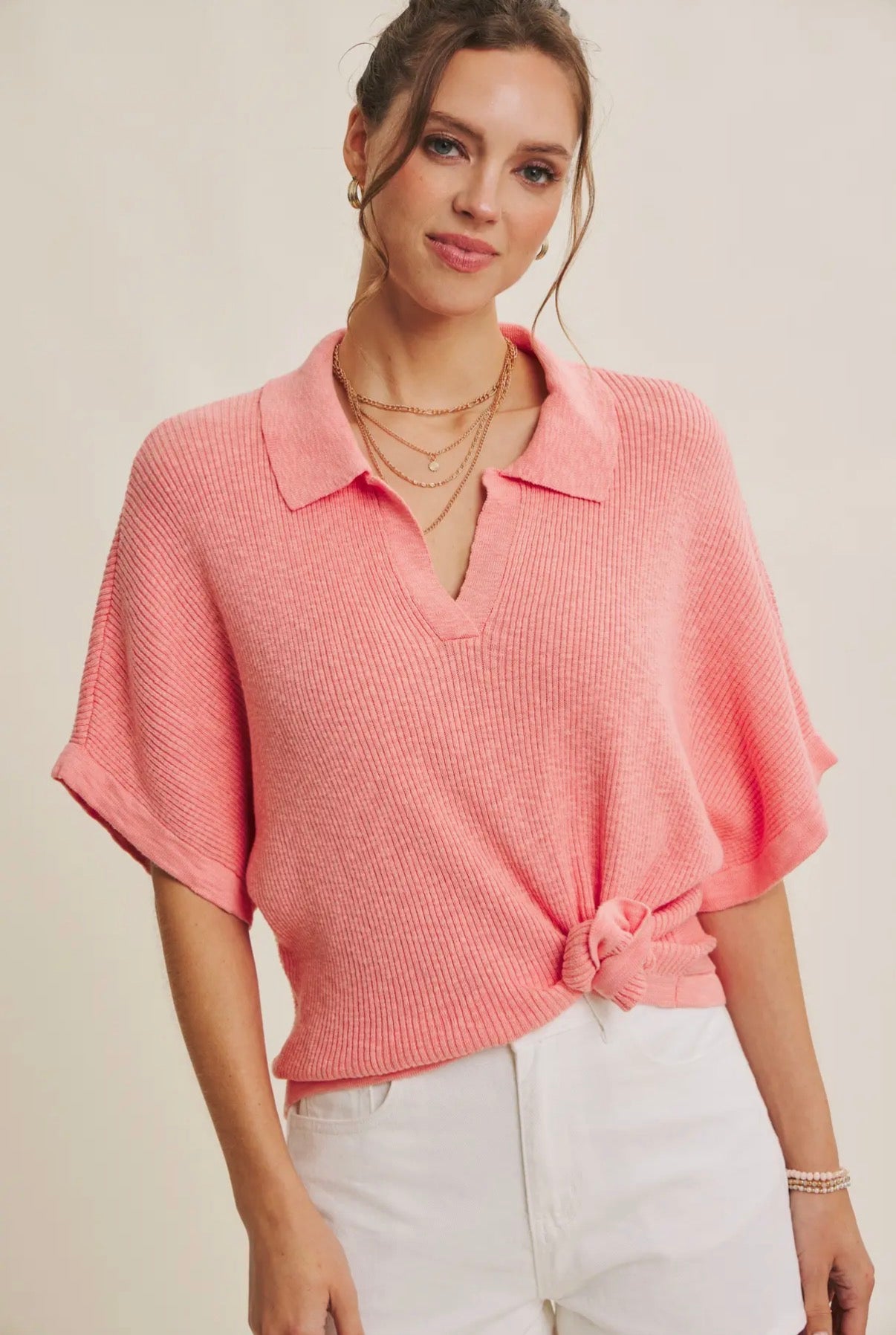 A proven bestseller designed for effortless, all-season styling. This slub rib knit top features a soft polo-style split neckline and relaxed dolman sleeves that drape naturally without feeling oversized. The breathable cotton-viscose blend gives it an airy hand feel, making it perfect for warm days while still ideal for layering under jackets or cardigans as the seasons shift. The subtle rib texture adds dimension without heaviness, and the easy silhouette allows for multiple styling options: wear it tucked, loose, or front-tied for a casual elevated look. From summer shorts and resort trousers to fall denim and tailored pants, this is a true year-round staple with strong reorder demand. A consistent bestseller in both neutrals and statement hues. Features - Split neck - Collared neck - Slub textured - Rib knit - Short dolman sleeves - Cotton viscose blend - Relaxed fit - Drapey - Stretchy