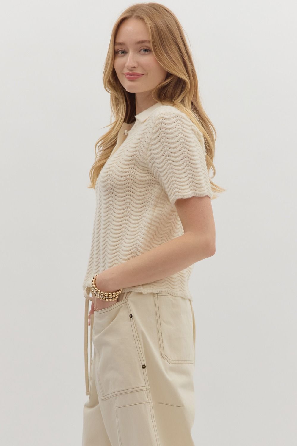 Solid wave pattern sweater knit short sleeve top. Collar button closure at front. Unlined. Knit. Non-sheer. Lightweight.