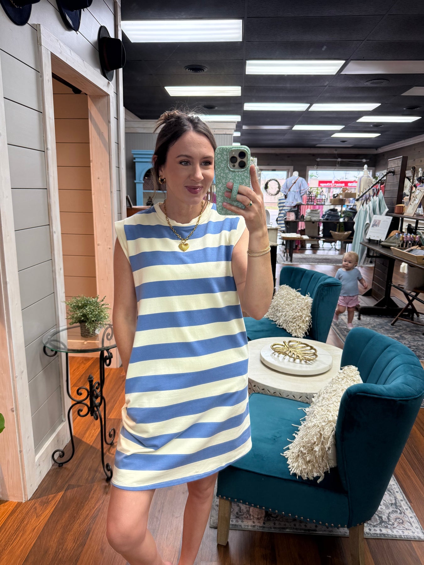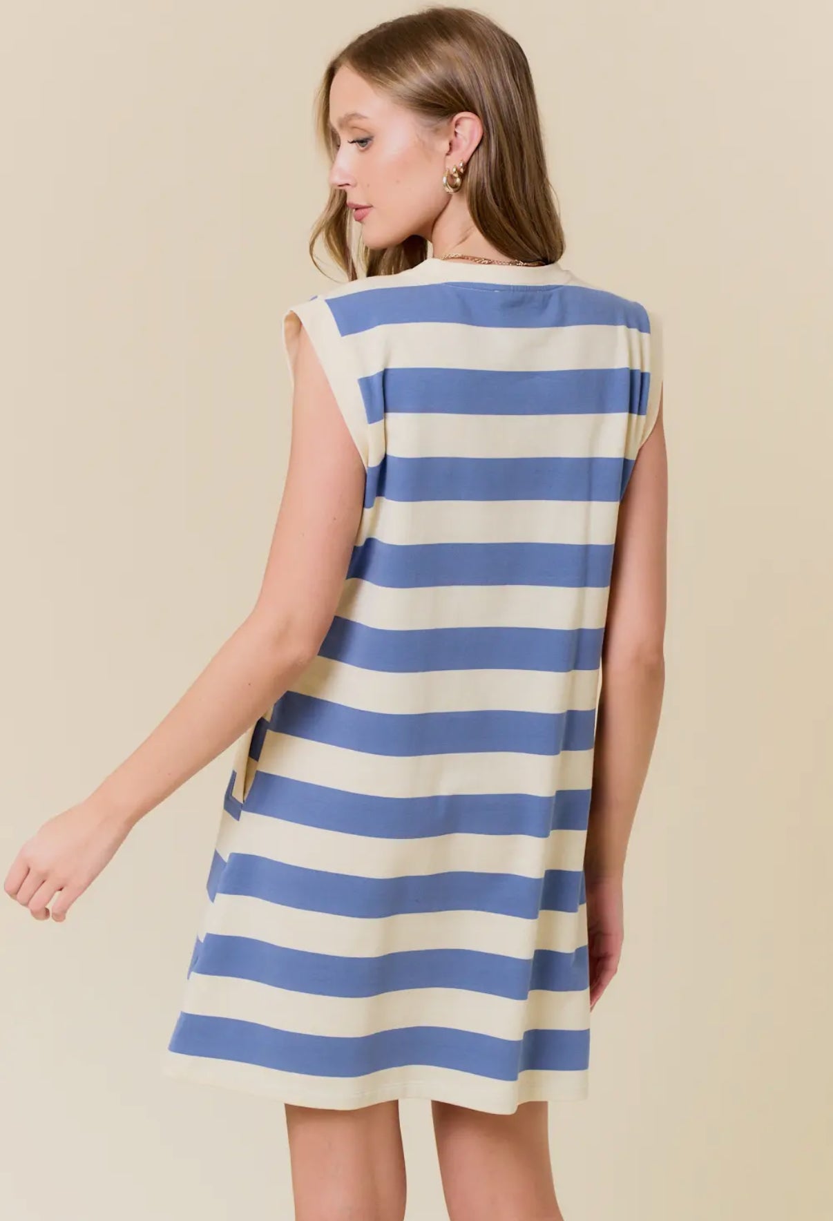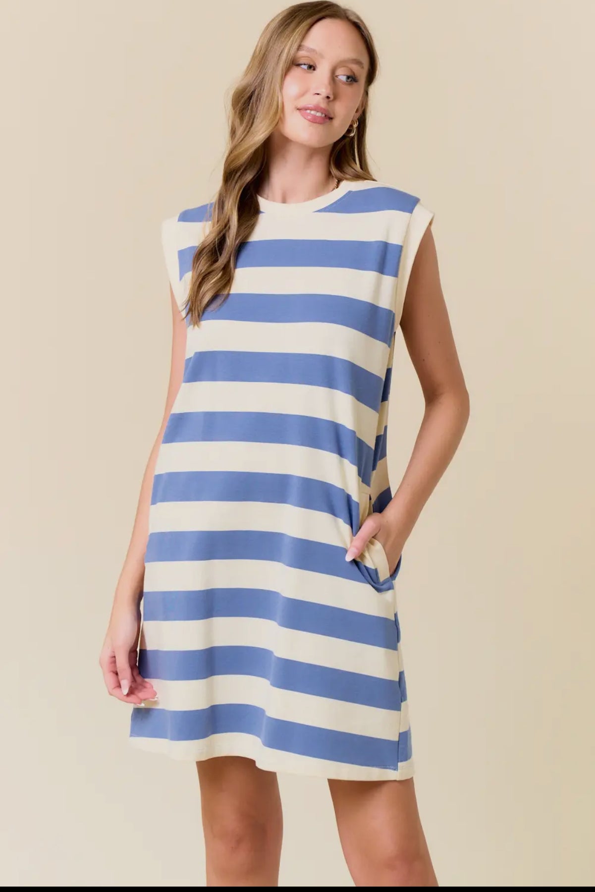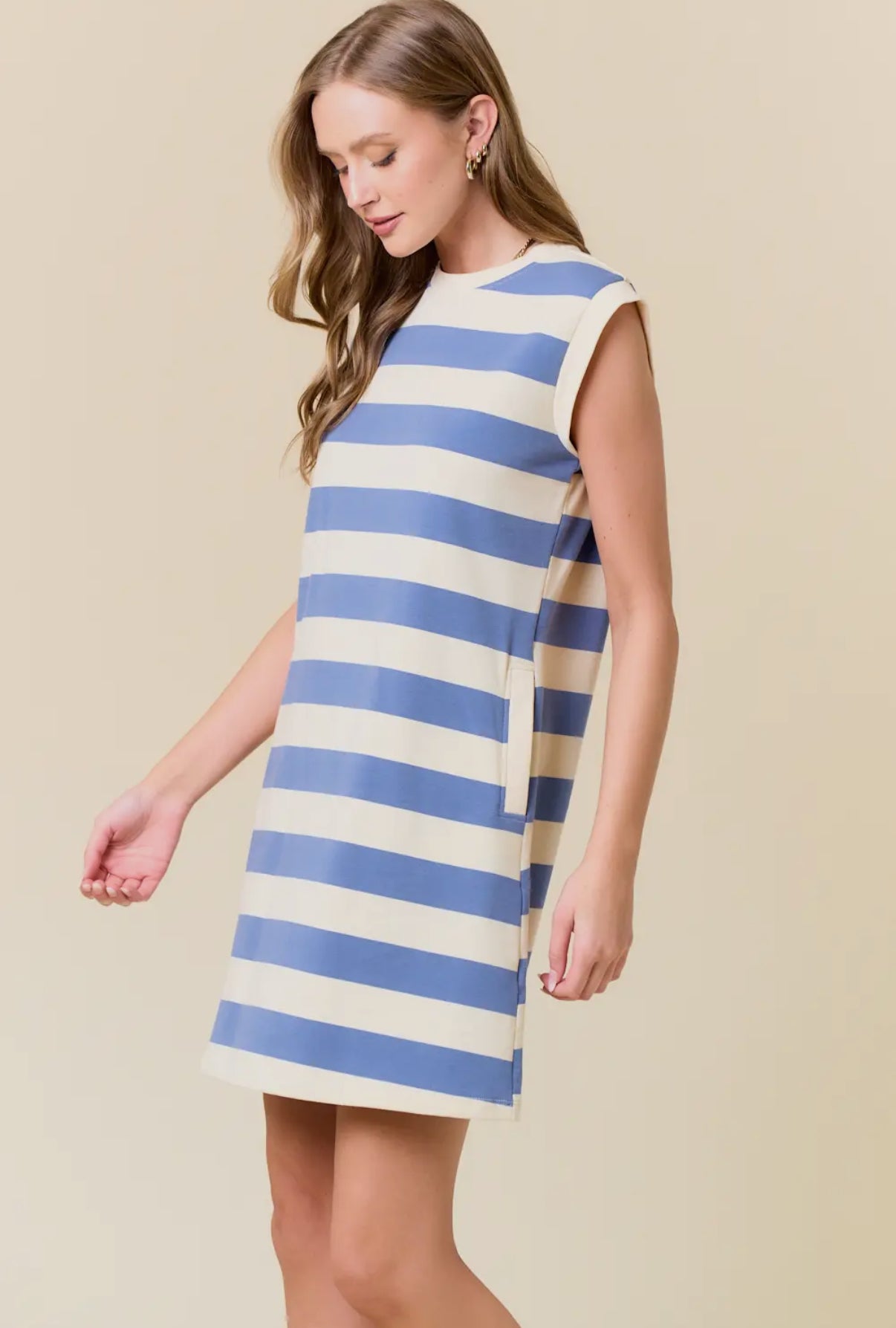 RUGBY STRIPED FRENCH TERRY ROUND NECK CAP SLEEVE MINI DRESS W/ SIDE POCKETS - French terry fabric construction with classic rugby stripe pattern - Sleeveless shoulder with slight cap extension - Wide horizontal stripe pattern - Side seam pockets